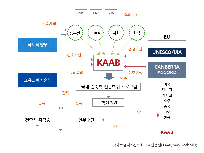 • 건축사 자격시험에 응시하려면 한국건축학교육인증원(교육과학기술부장관으로부터 인증기관으로 지정 받은 기관)이 인증한 5년제 대학 또는 대학원의 건축학교육 과정을 이수하고 건축사사무소에서 3년간의 실무수련을 받도록 함.